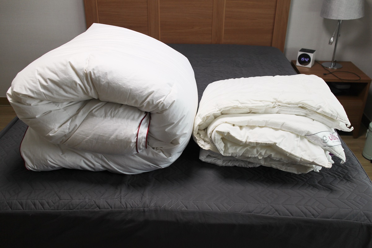 원래 쓰던 울트렐 이불솜과 새로 산 클래식패브릭 구스다운이불.