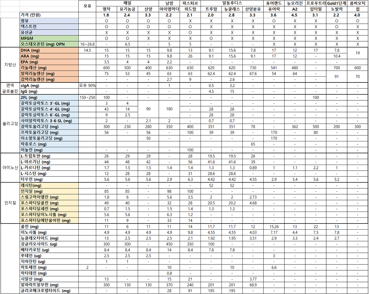 대략 국내에서 많이들 먹이는 분유와 한국엄마들이 선호하는 외국분유 (압타밀, 노발락, 힙)을 비교해봤는데,