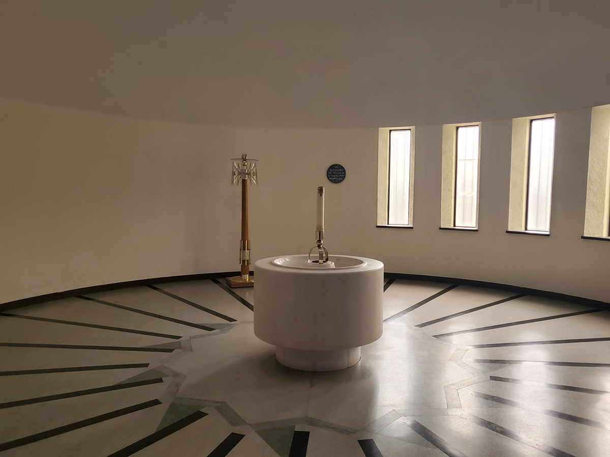 원형의 건물에 푸른색 스테인드글라스를 통해 빛이 들어오는데,
