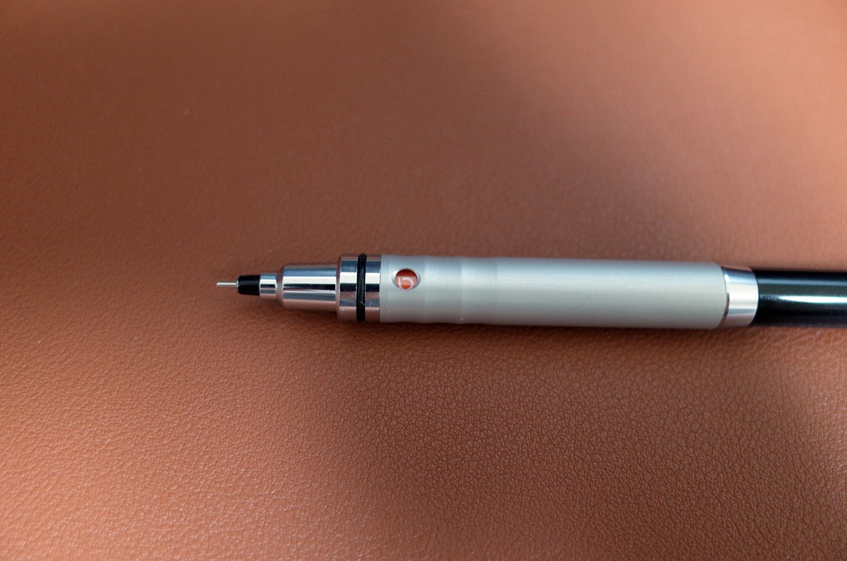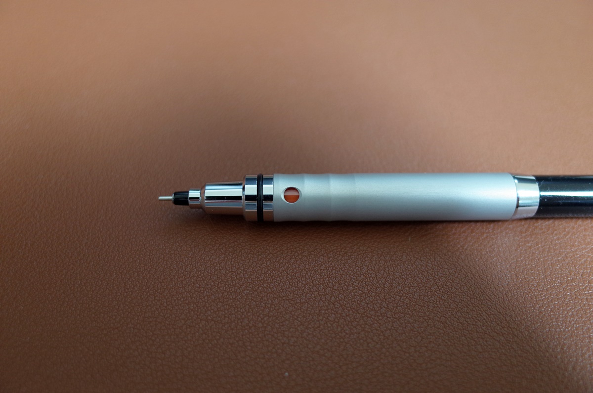 첨단이 돌아가면, 샤프심 모서리를 균일하게 돌려가며 쓰는 셈이 되어 글씨 굵기가 균일하게 계속 쓸 수 있다.